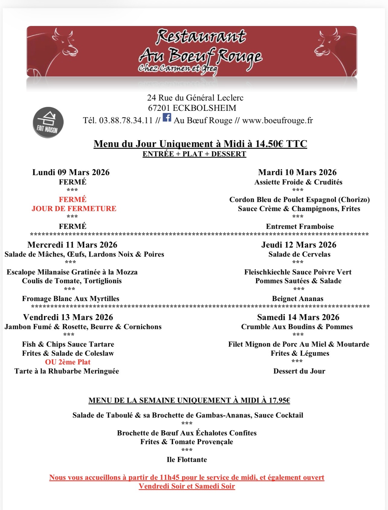 ÉGALEMENT OUVERT VENDREDI ET SAMEDI SOIR À PARTIR DE 19H00 Plat du Jour Entrée + Plat + Dessert à 14.50€ Du Mardi au Samedi Midi ********* Nous Vous Proposons Également Notre Carte L’équipe du Bœuf Rouge Eckbolsheim ☎️ 03.88.78.34.11 ☀️ Restaurant Climatisé ☀️ 🌴Terrasse d’Été Ombragée🌴