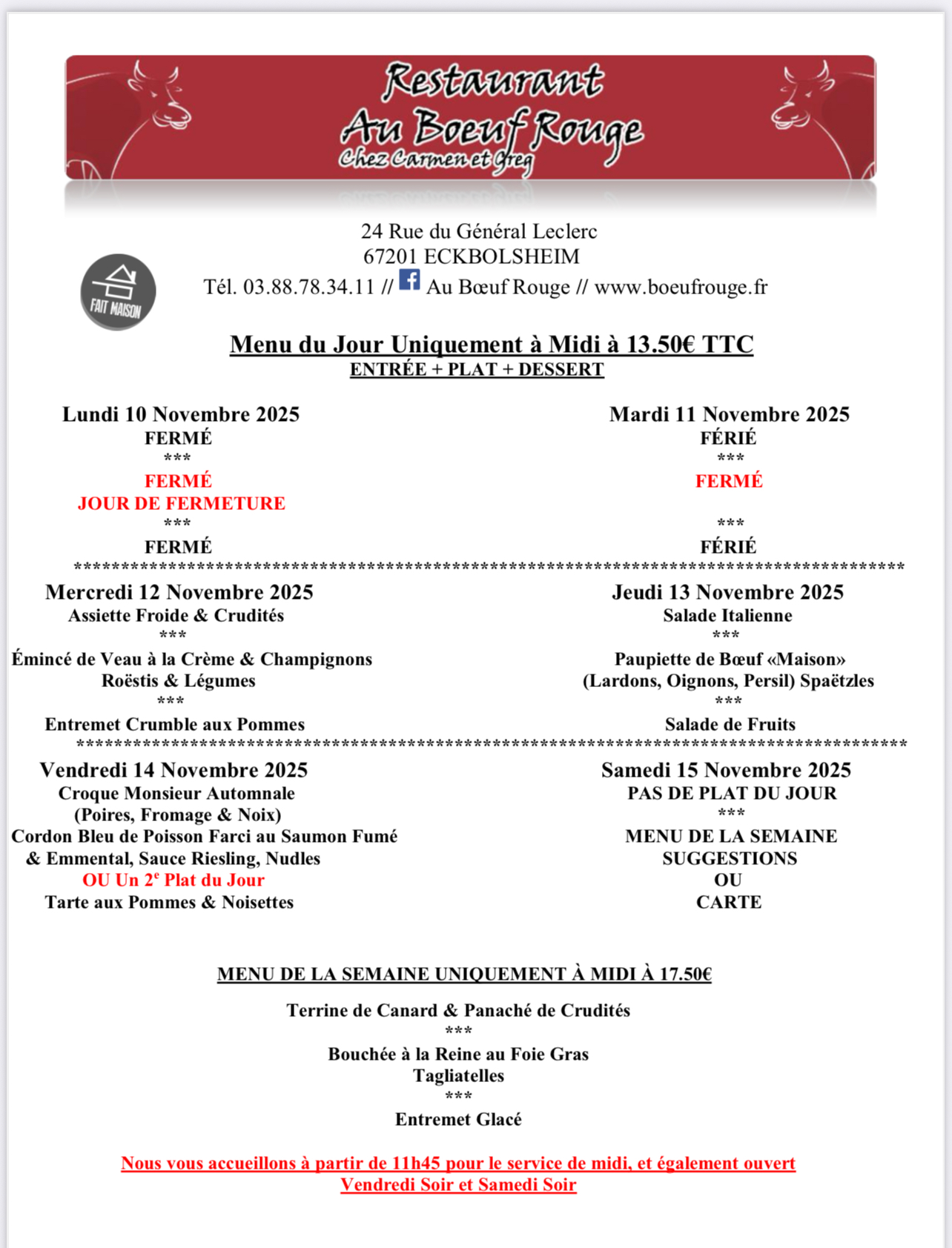ÉGALEMENT OUVERT VENDREDI ET SAMEDI SOIR À PARTIR DE 19H00 Plat du Jour Entrée + Plat + Dessert à 13.50€ Du Mardi au Samedi Midi ********* Nous Vous Proposons Également Notre Carte L’équipe du Bœuf Rouge Eckbolsheim ☎️ 03.88.78.34.11 ☀️ Restaurant Climatisé ☀️ 🌴Terrasse d’Été Ombragée🌴